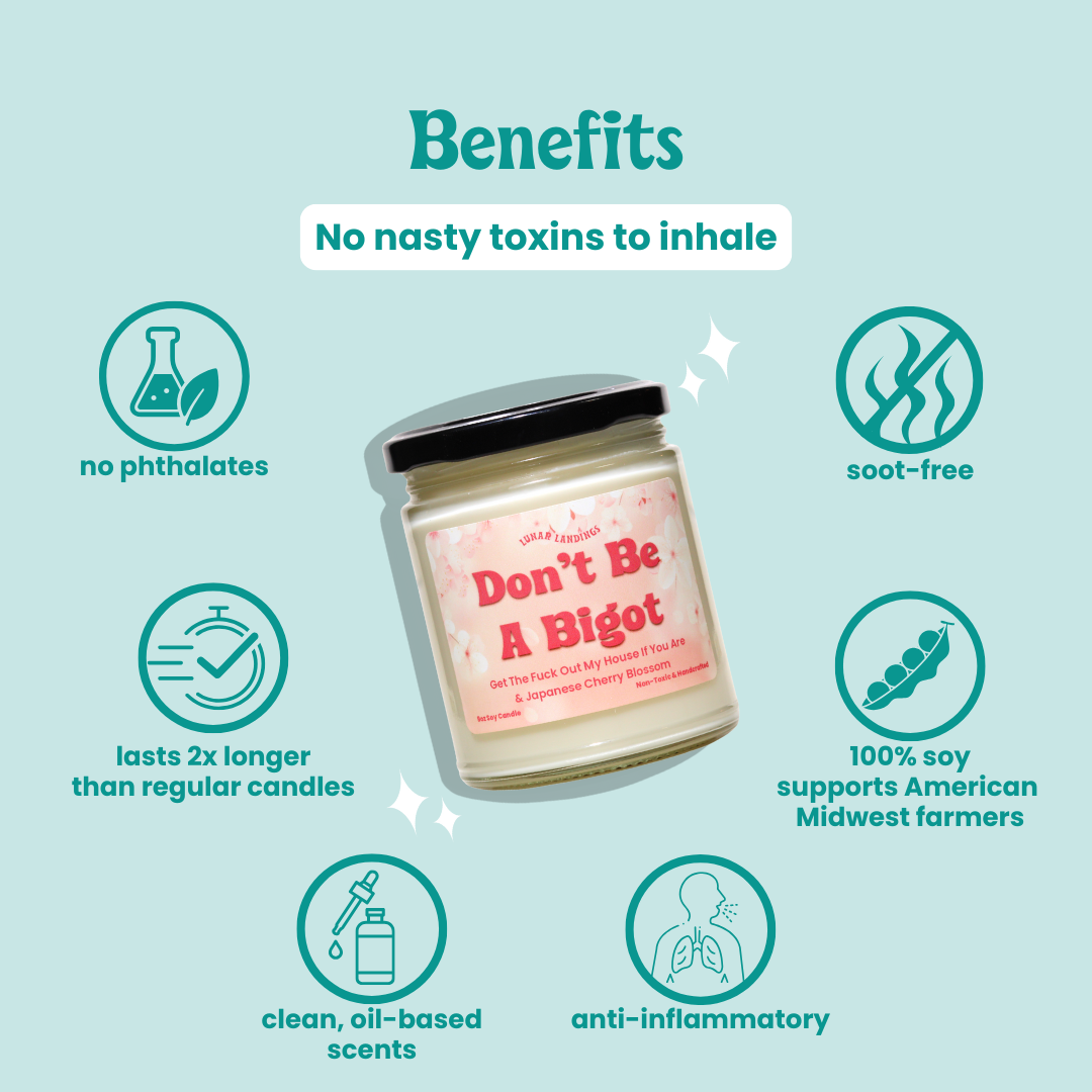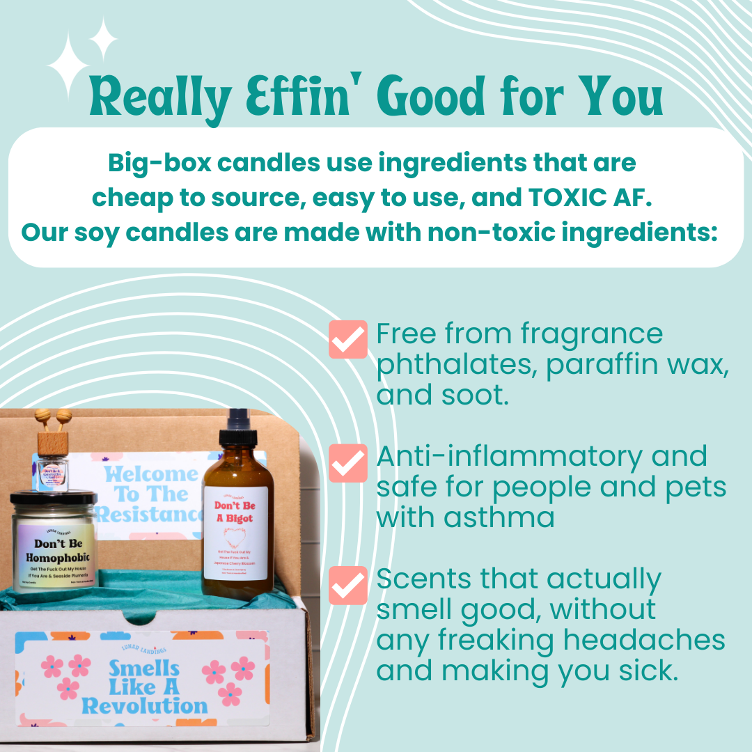 You know who really needs to get their shit together? Ignorant people and BIG-BOX candle factories. Store-bought candles, car fresheners, and room sprays are full of toxic chemicals like toxic bigotry.