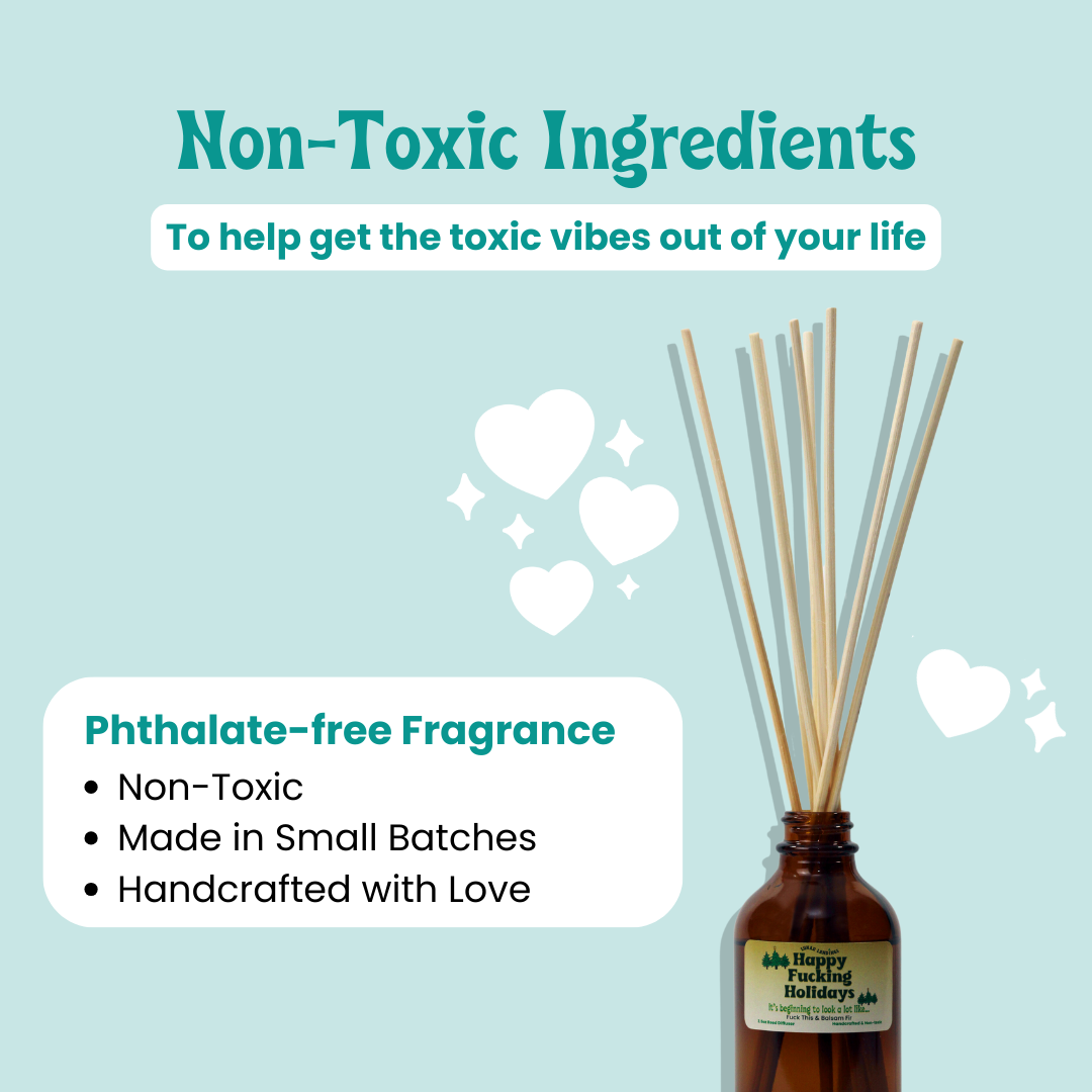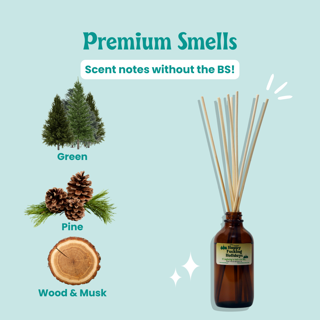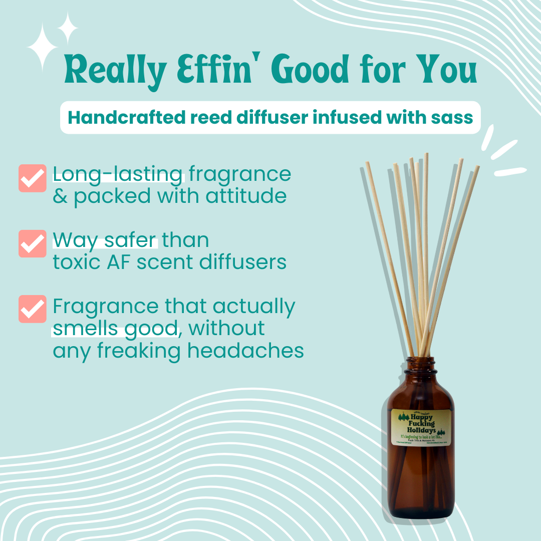 If you love a low-maintenance moment, then you’ll love our reed diffusers. Our Happy Fucking Holidays diffuser is so easy to set & forget. It’s Balsam Fir scented and the perfect accessory for your desk, bathroom vanity, closet, and more! Our Balsam Fir reed diffuser is also non-toxic AF. 🙌🎄