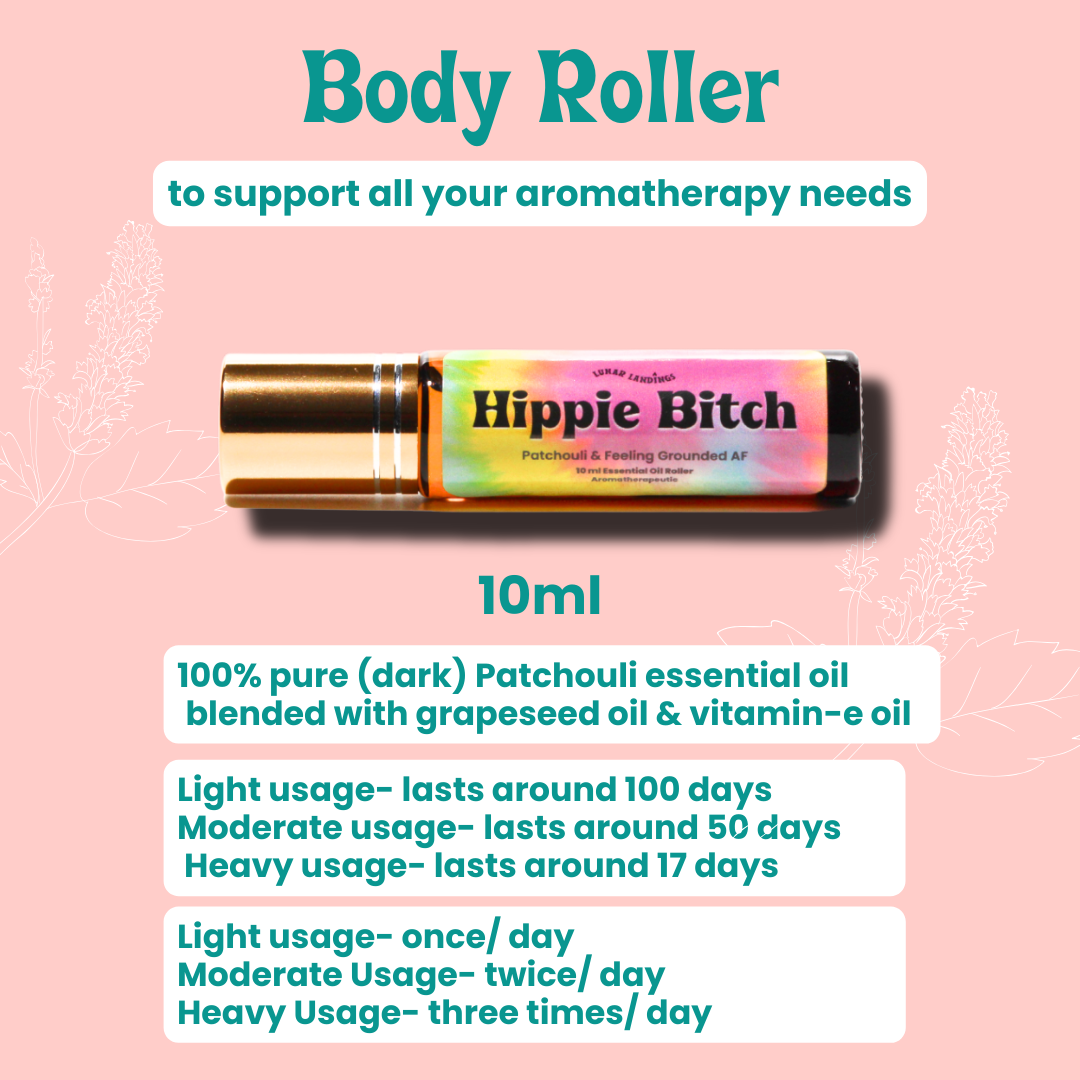 Our body rollers are infused with 100% pure Patchouli (dark) essential oil.