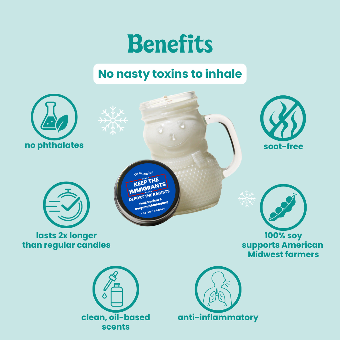 Hand-poured in small batches, non-toxic, clean-burning, and topped with one of 10 bold, seasonal protest labels.